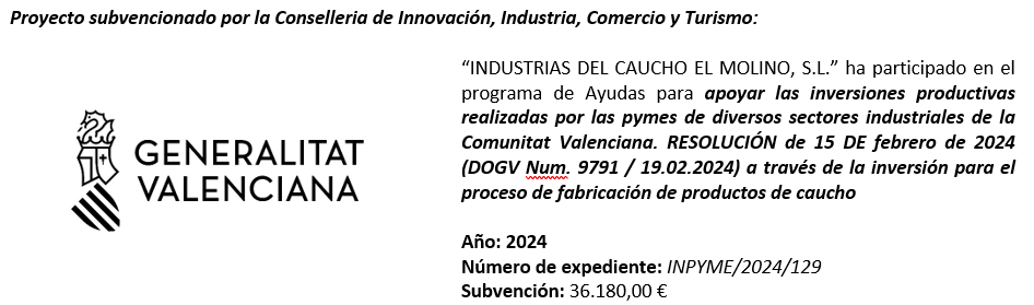 “INDUSTRIAS DEL CAUCHO EL MOLINO, S.L.” ha participado en el programa de Ayudas en materia de industrialización para inversiones de PYMES INDUSTRIALES de la Comunitat Valenciana que mejoren la competitividad y sostenibilidad de determinados sectores, dentro de la sexta fase de implantación del Plan Estratégico de la Industria Valenciana, para el ejercicio 2023 (INPYME). Industria. RESOLUCIÓN de 27 de diciembre de 2022 (DOGV Num. 9501 / 30.12.2022)